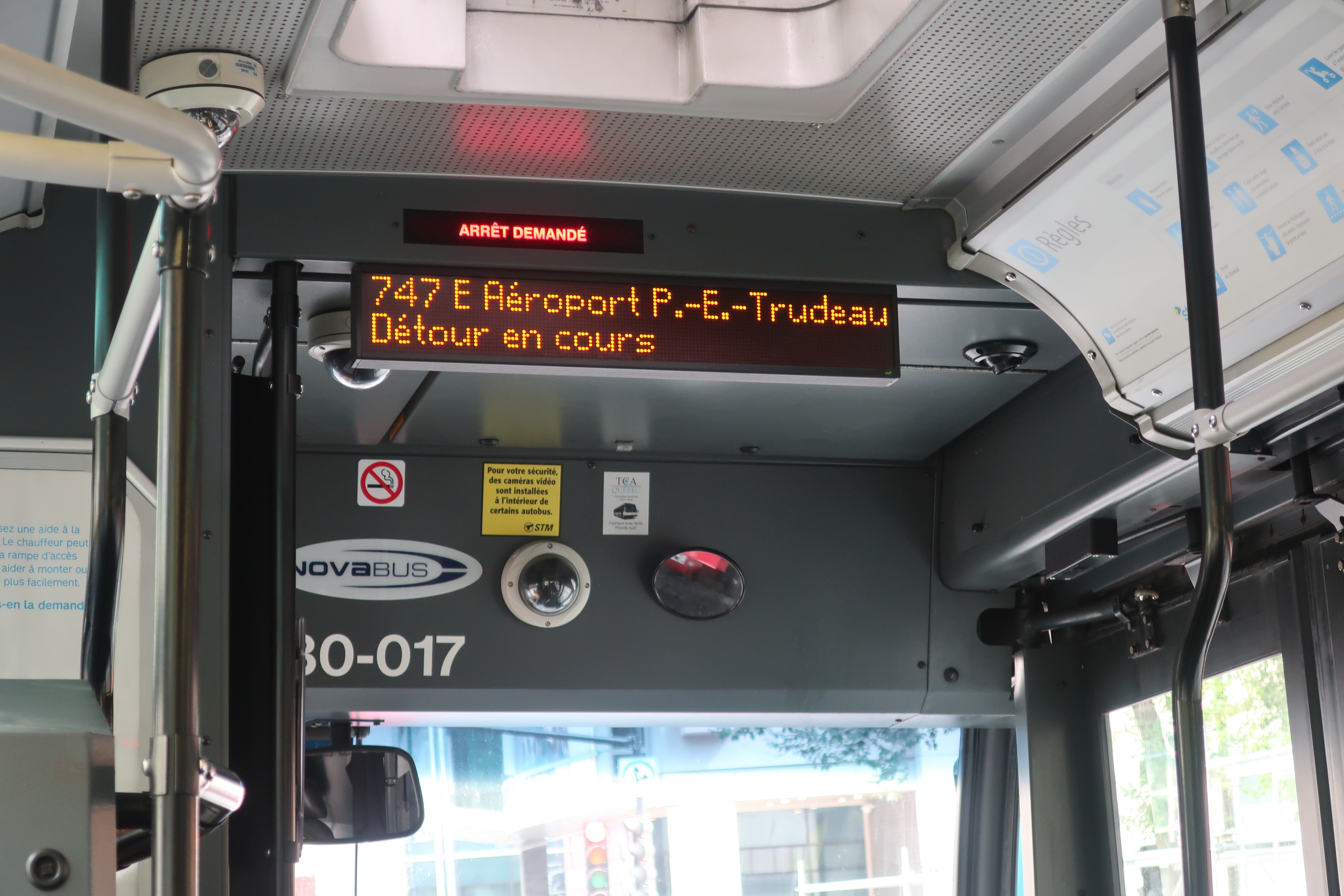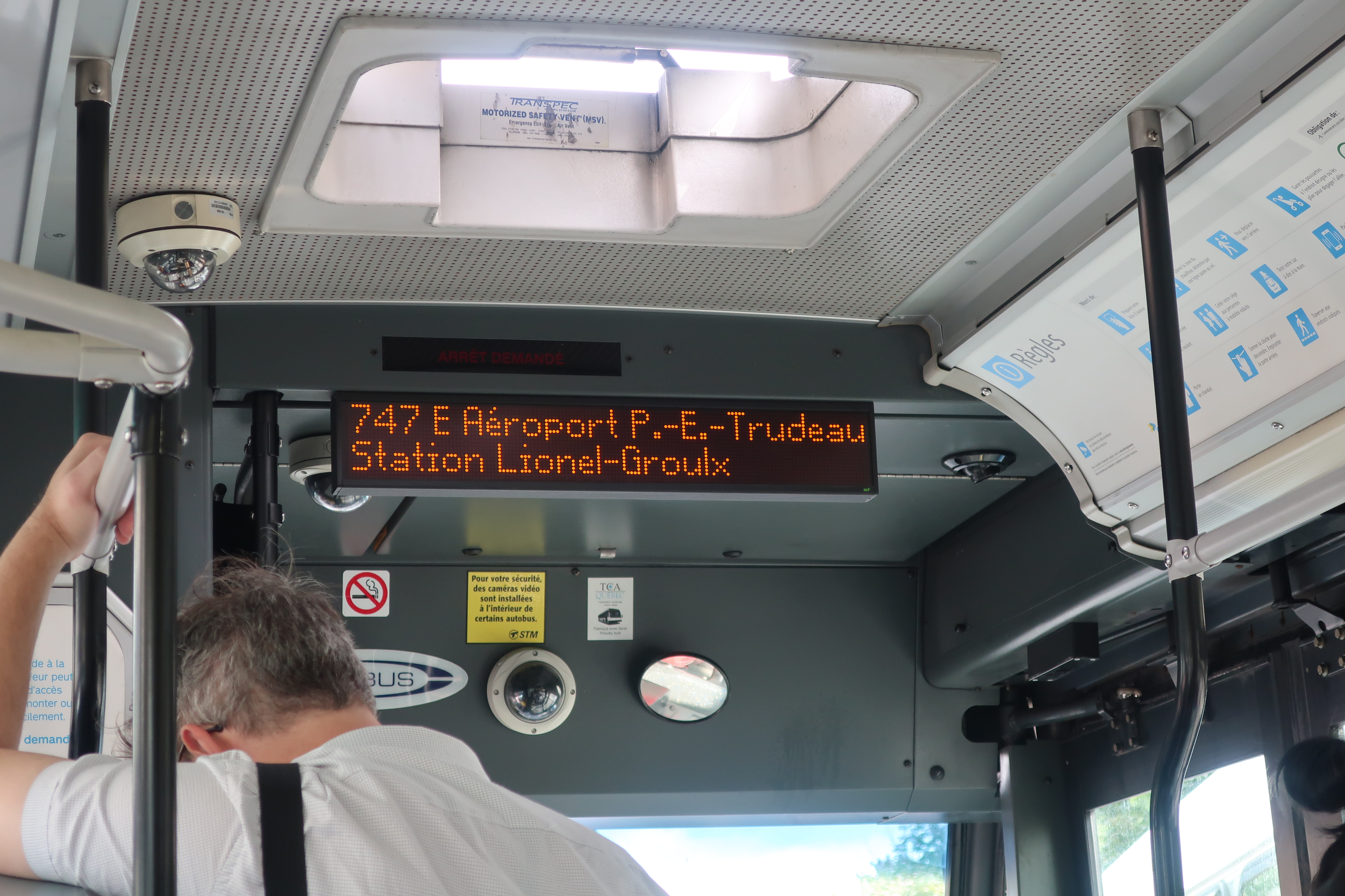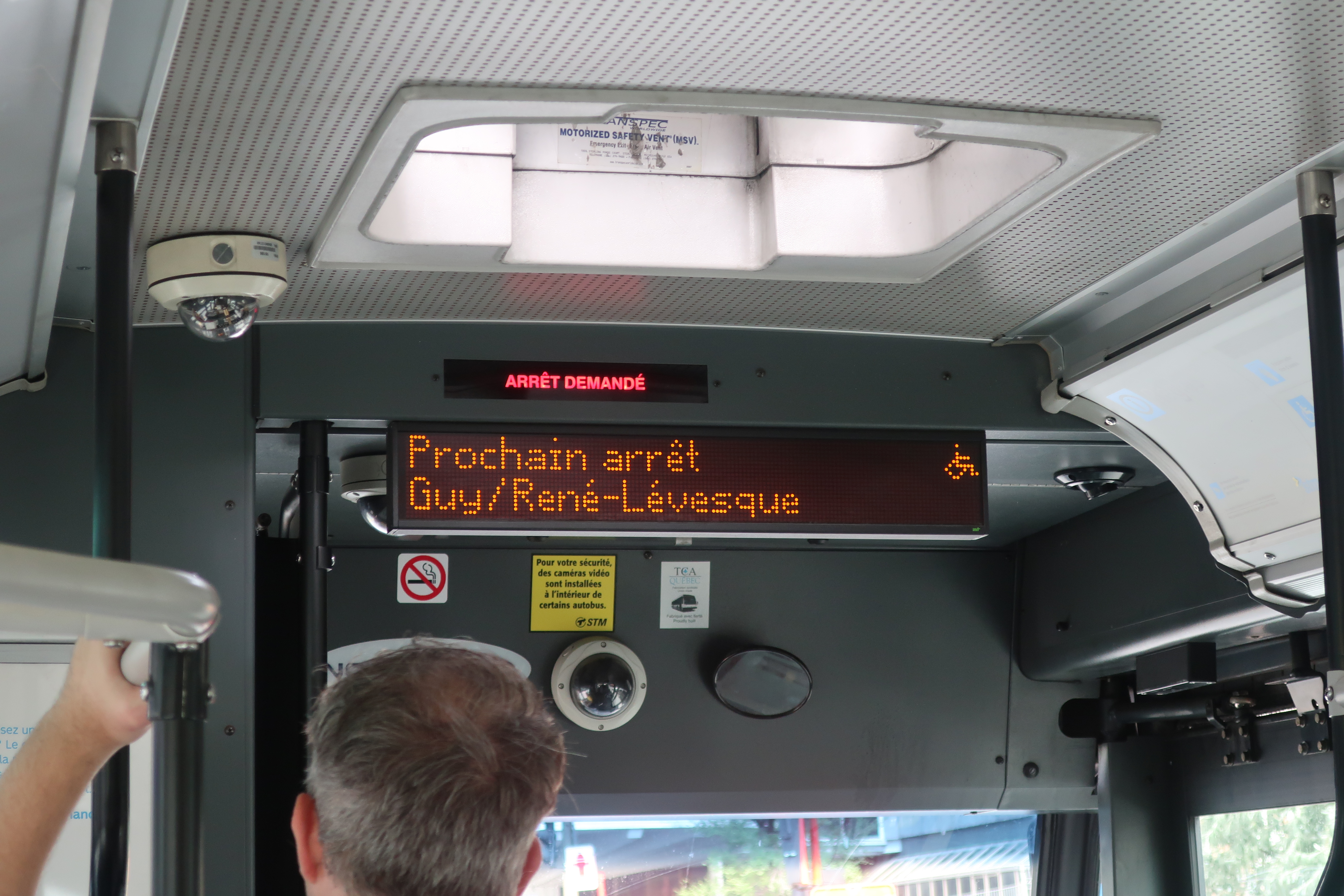 The buses had my favorite interior display I have yet seen on a bus. These clear-as-day 2-line LED panels were well utilized, to show route name, destination, transfers (not pictured), accessibility information, and "détour en cours" (route on detour).